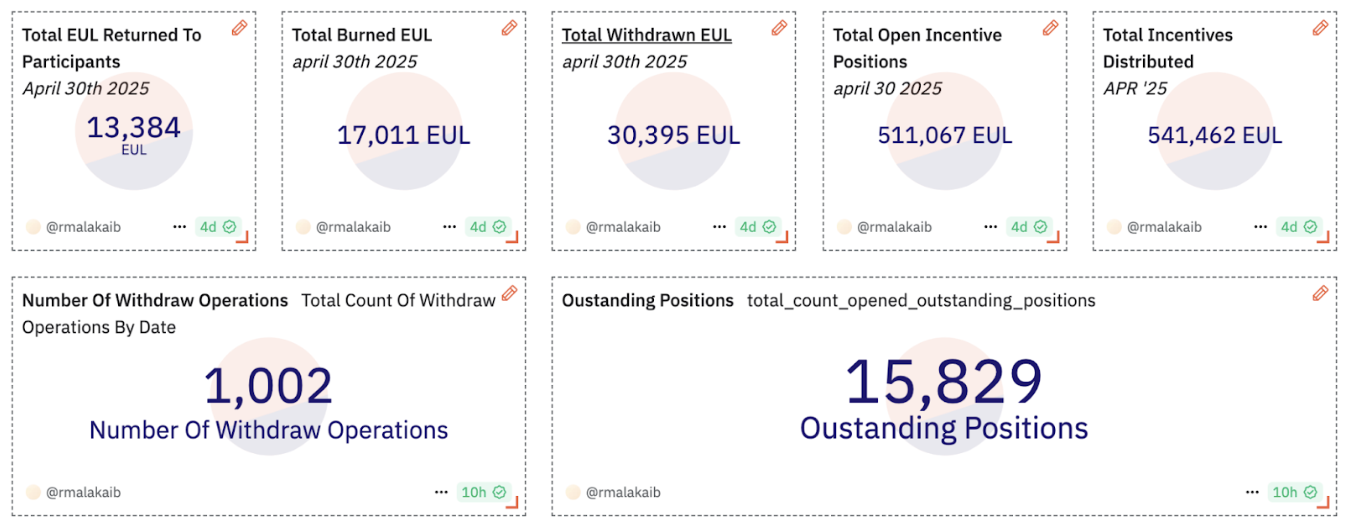 - Latent Demand Revealed By Redemption Behavior | Across chains, outstanding (claimed‑but‑unwithdrawn) rewards tower actual withdrawals. Low early redemptions and an aging cohort of positions imply the prevailing EUL price still sits below recipients’ opportunity‑cost threshold. Monitoring the redemption‑to‑price ratio is critical for tuning emission levels.